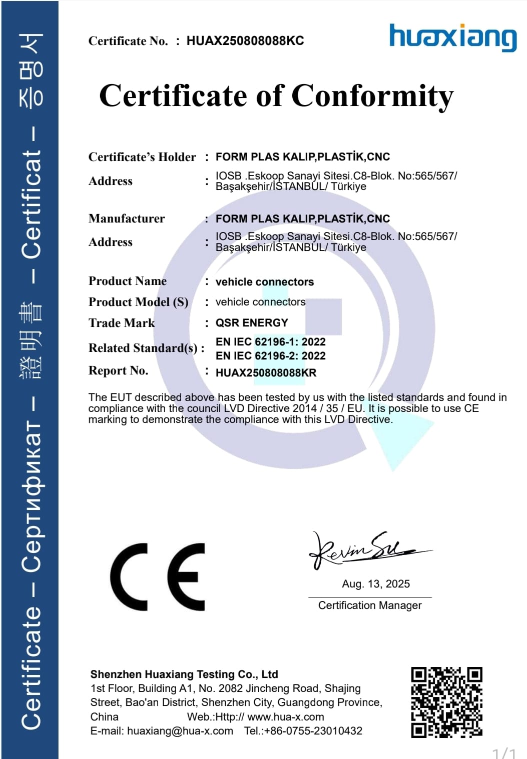 E-Qsr, elektrikli araç şarj teknolojilerinde güvenilirlik ve üstün kalite anlayışıyla sektörde fark yaratmaktadır. Ürünlerimiz, dünyanın önde gelen otomotiv markalarının sıkı kalite ve güvenlik standartlarına uygun olarak titizlikle tasarlanıp geliştirilmiştir. Kalite ve performans konusundaki kararlılığımızı, uluslararası geçerliliğe sahip sertifikalarımızla da kanıtlıyoruz. Özellikle şarj kablolarımız, CE sertifikasının yanı sıra IEC 62196-2 standardına tam uyumluluk göstererek, hem güvenlik hem de performans açısından yüksek kalite seviyesini garanti eder. Müşterilerimiz, kalite belgelerimizi görseller üzerinden detaylı inceleyebilir; böylece ürünlerimizin uluslararası standartlara uygunluğu ve güvenilirliği hakkında doğrudan bilgi sahibi olabilirler. E-Qsr olarak, teknoloji ve kaliteyi bir araya getirerek elektrikli araç şarj çözümlerinde sektörün öncü markalarından biri olmaya devam ediyoruz.